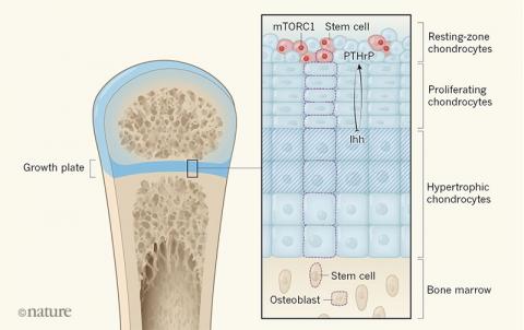 연구자들은 성장기에 뼈끝에서 오는 신호가 줄기세포의 mTORC1 경로를 활성화해 줄기세포가 대칭 세포분열을 하게 성격을 바꾼다는 사실을 알아냈다. 또 비대 연골세포와 둥근 연골세포가 신호를 주고받아 연골세포의 길이 방향 증식을 촉진하는 것으로 밝혀졌다. 이 신호를 방해하면 연골세포 기둥이 짧아진다.