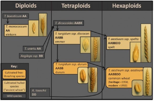 밀속(屬) 식물의 진화를 재구성한 결과 여러 차례 이종교배가 일어나며 게놈이 늘어났다는 사실이 밝혀졌다. 즉 듀럼밀은 4배체(AABB)이고 빵밀은 6배체(AABBDD)다. 밀 게놈 진화는 다소 복잡한 주제로, 관심이 있는 독자는 <곡물 게놈 해독이 동물 것보다 복잡할까? https://goo.gl/NdXKwy> 를 읽어보기 바란다.